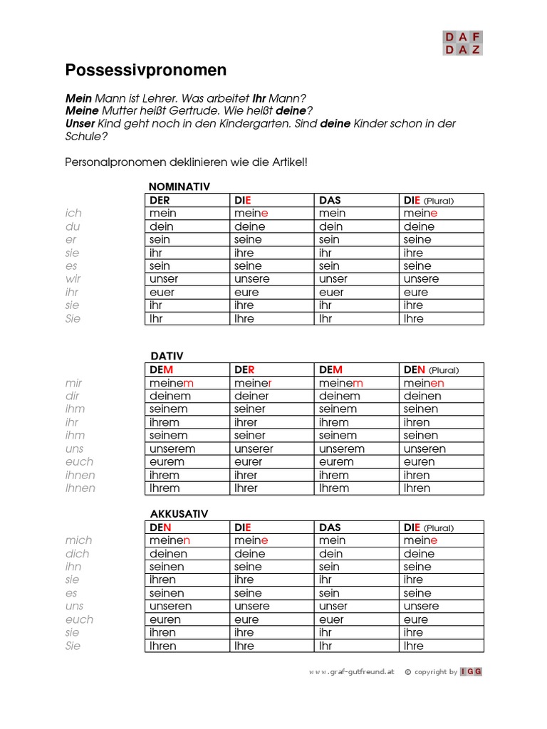 Possessivpronomen 1) was man über possessivpronomen wissen sollte. Definition, rechtschreibung, synonyme und grammatik von 'dein' auf duden online nachschlagen. Ihr browser unterstützt inlineframes nicht oder zeigt sie in der derzeitigen konfiguration nicht an. Possessivpronomen bestimmen besitzverhältnisse und richten sich nach der person, auf die sie sich beziehen oder nach einer sache. Frage mögliche antworten genitiv wessen uhr ist das?